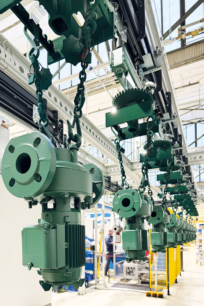 The coating plant was built by Deteco (Porcia, Pordenone, Italy), which developed a compact and functional system while also acting as the prime contractor for this project. The line handles the coating of cast iron pumps of various sizes, from about 7 kg to 150 kg, totalling over 400 models and variants. The pumps to be treated reach the loading area on special pallets. Here, an operator rotates them 180°, and with the help of an automatic lifting system, places them on the load bars of the power & free conveyor designed by Conveyors Nord (Inzago, Milan, Italy).