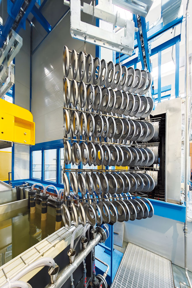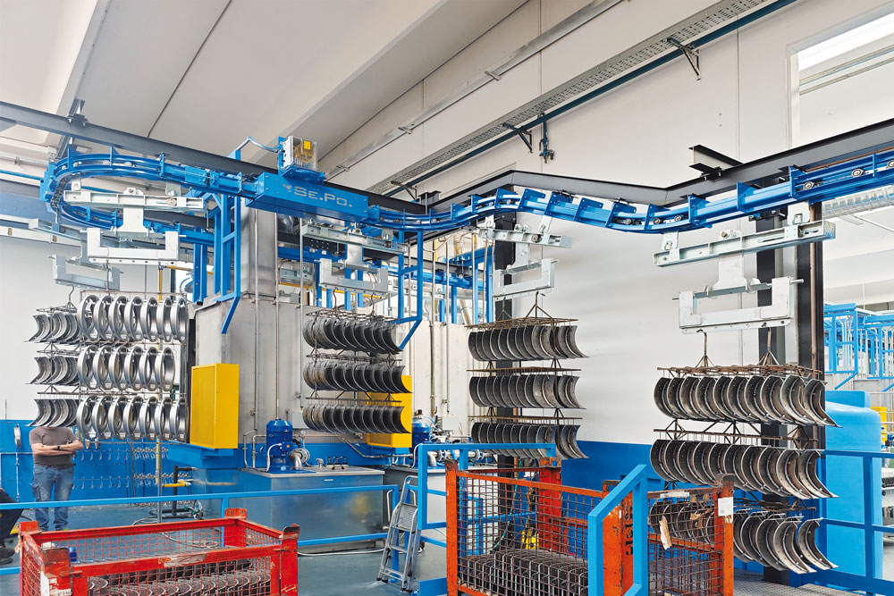 Pezzi prima del trattamento di cataforesi: l’impianto è stato progettato per una capacità produttiva di 12 bilancelle/ora. Ⓒ Silvi