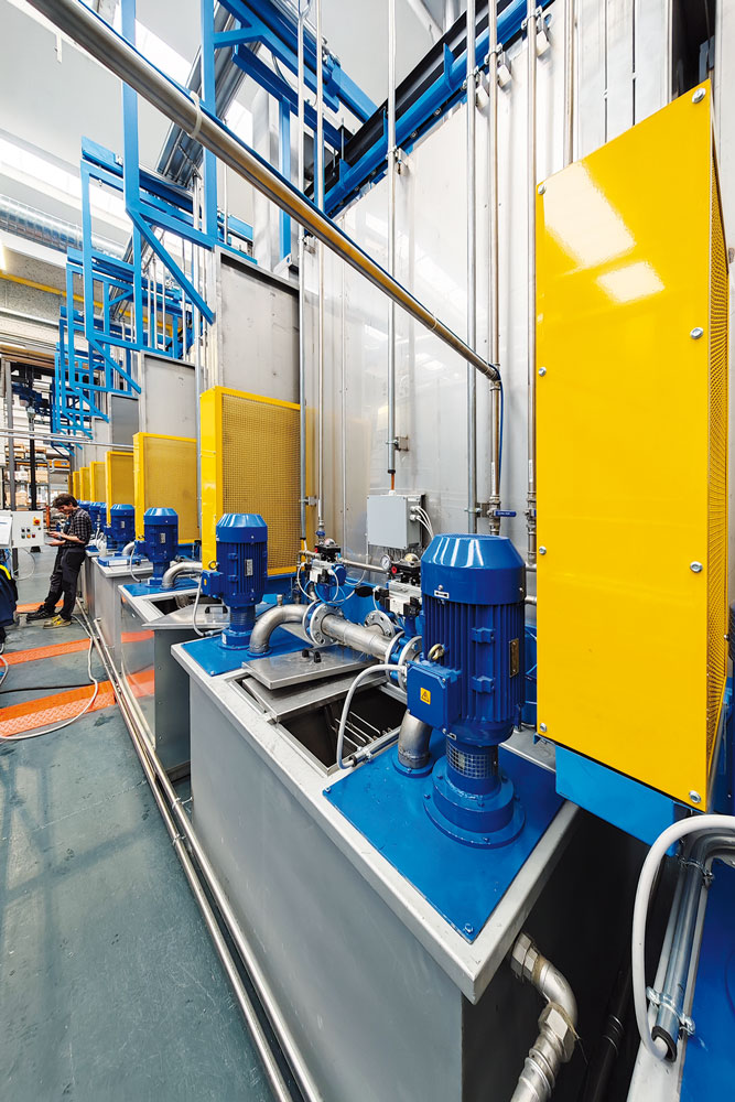“L’impianto è dotato di un sistema centralizzato di aspirazione e abbattimento fumi a servizio delle linee di trattamento e di cataforesi, costituito da scrubber a umido in polipropilene”, spiega Daniele Fumagalli. “Sono previsti due abbattitori separati: uno dedicato ai fumi caldi provenienti dai processi termici e uno ai fumi freddi generati dalle vasche di trattamento chimico. A supporto dell’impianto di trattamento superfici e cataforesi è installato un sistema di stoccaggio e rilancio dei prodotti chimici e di gestione delle acque reflue. I reflui vengono trattati mediante un evaporatore sottovuoto, che consente il recupero fino al 95% dell’acqua e permette la gestione dell’impianto in regime di scarico zero.”
