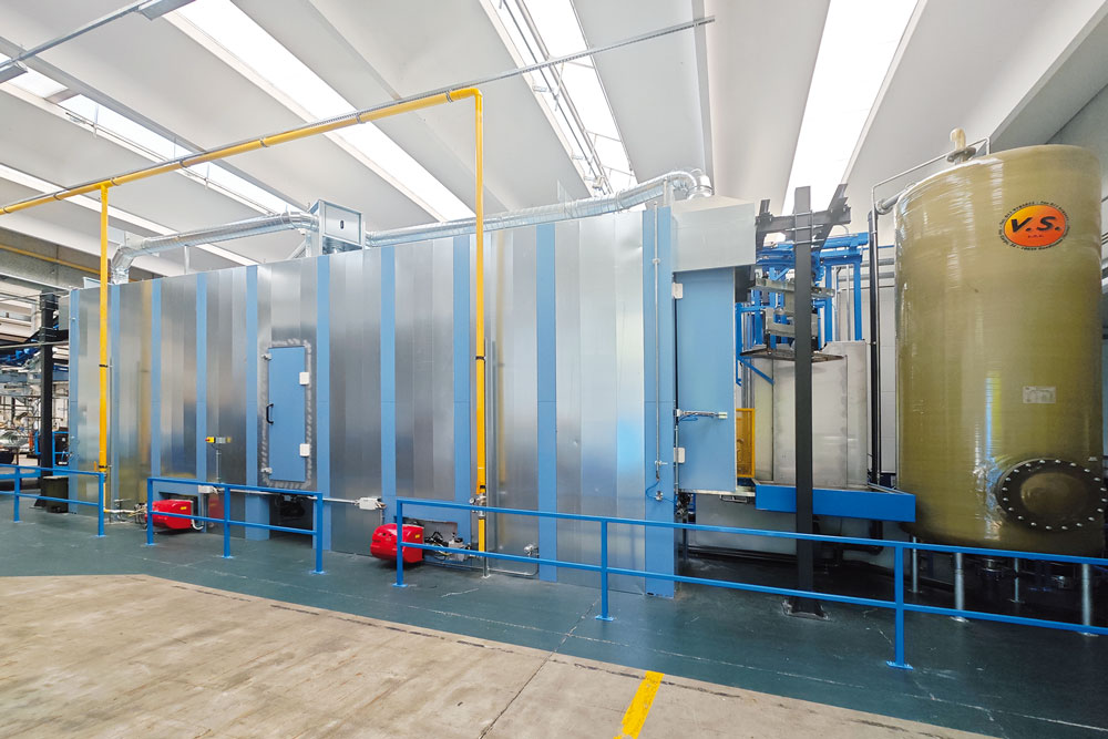 Terminato il trattamento di cataforesi, i pezzi sono sottoposti a doppio risciacquo con ultrafiltrato e successivo soffiaggio, per poi accedere al forno di cottura a celle chiuse con scambiatori in vena d’aria. Il ciclo si conclude con lo scarico delle bilancelle. L’impianto è stato progettato per una capacità produttiva di 12 bilancelle/ora.