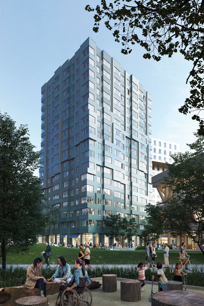 Il cladding della torre di 17 piani e 58 m di altezza è costituita da pannelli verdi brillanti che richiamano le tradizionali finestre a bovindo rivestite in rame, tipiche di Boston. Ⓒ MVRDVEstetica e finiture