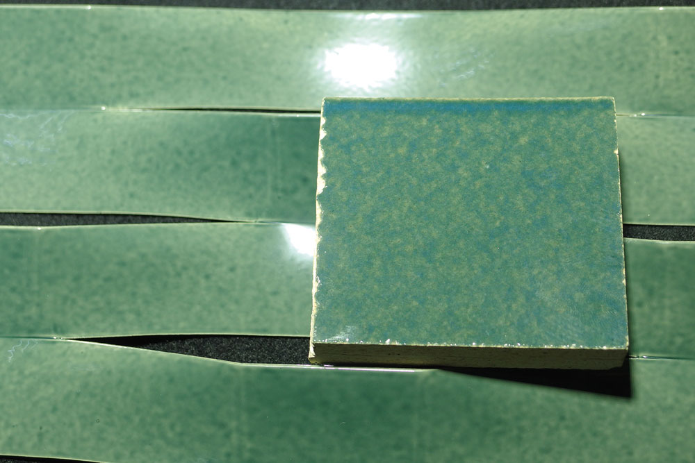 Il prodotto della collezione ENAMEL applicato su lamiera stirata accanto al campione ceramico reale. Ⓒ AdaptaCaratteristiche della collezione Vivendi SDS ENAMEL