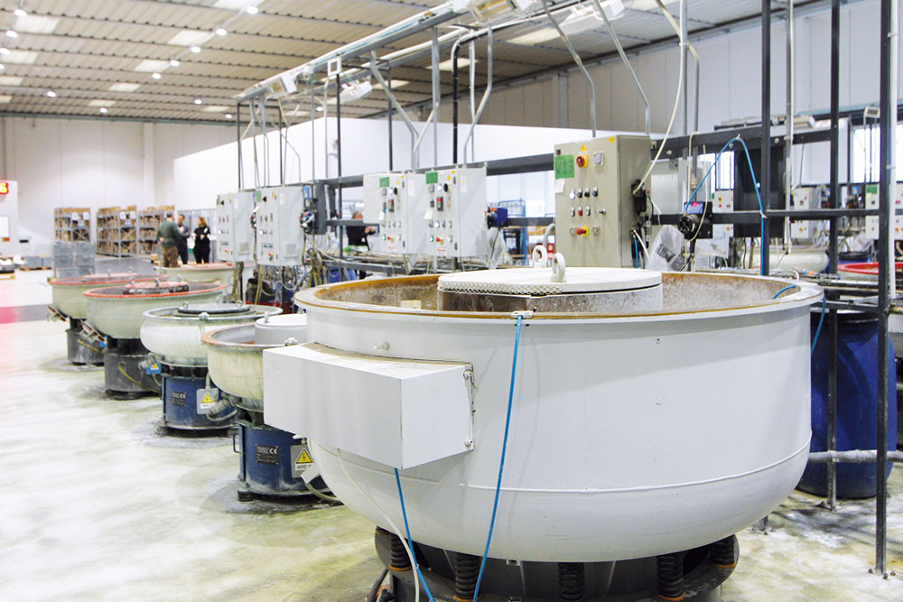 Per la finitura in massa dei propri componenti Figros utilizza 14 impianti di vibratura e vibrofinitura e 2 di asciugatura. Ⓒ ipcm