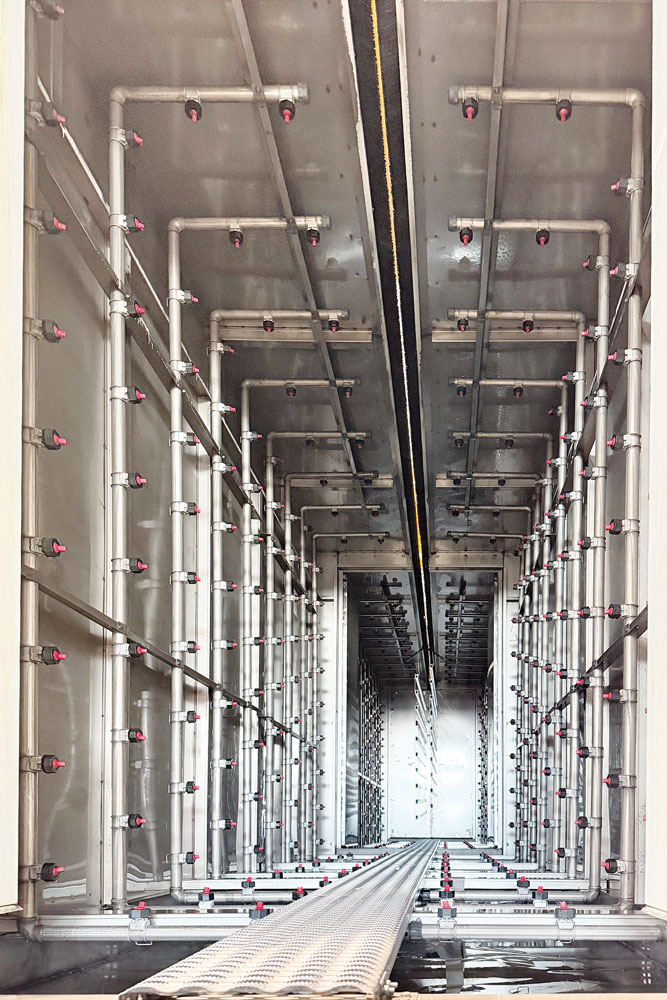 L’interno del tunnel di pretrattamento a spruzzo con ciclo di fosfatazione tricationica messo a punto in collaborazione con NoxorSokem. © ipcm®