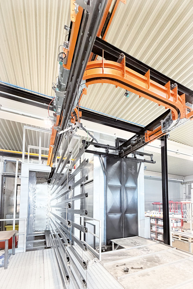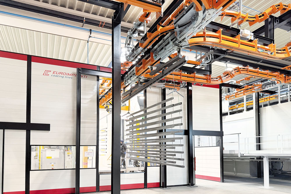 Dal punto di vista concettuale, l’impianto è stato progettato da Euroimpianti per essere semplice, flessibile e altamente efficiente. La configurazione prevede una sequenza lineare di carico, sezione di pretrattamento, forno di asciugatura, cabina di verniciatura, camera a campana di pre-riscaldo ad aria calda, forno di polimerizzazione e scarico finale. Il convogliatore, fornito da Railtechniek, è un birotaia organizzato su tre anelli concentrici, interconnessi in corrispondenza della cabina di verniciatura. Questa soluzione consente di gestire, all’interno della stessa giornata produttiva, cicli differenti senza compromessi in termini di qualità o produttività: