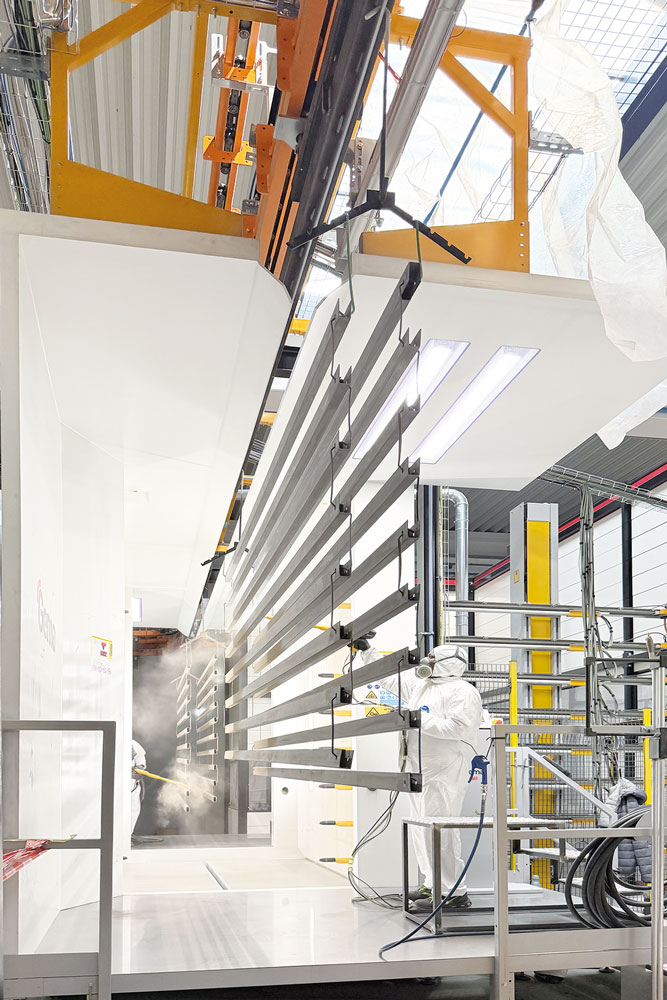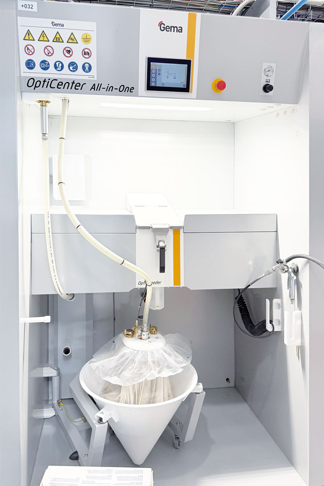 “La cabina fornita a Painter è il modello BA04 di forma rettangolare, dotata di doppia pedana in ingresso e in uscita, dimensionata per gestire pezzi di grandi dimensioni e geometrie complesse. L’automazione è affidata a 16 pistole automatiche GA04 (otto per lato) montate su reciprocatori 3D di ultima generazione, a cui si aggiungono due pistole manuali per il ritocco in ingresso e in uscita, per un totale di 18 pistole” spiega Marco Peduzzi, area manager di Gema Europe. “Il cuore del sistema di applicazione è il centro polveri Gema OC10 a singolo serbatoio in fase densa, equipaggiato con pompe AP02 e centraline All-In-One integrate. Le pistole operano a 110 kV e 110 µA e sono interconnesse tramite il sistema CM40, consentendo l’integrazione in ottica Industria 4.0 con i sistemi aziendali”.