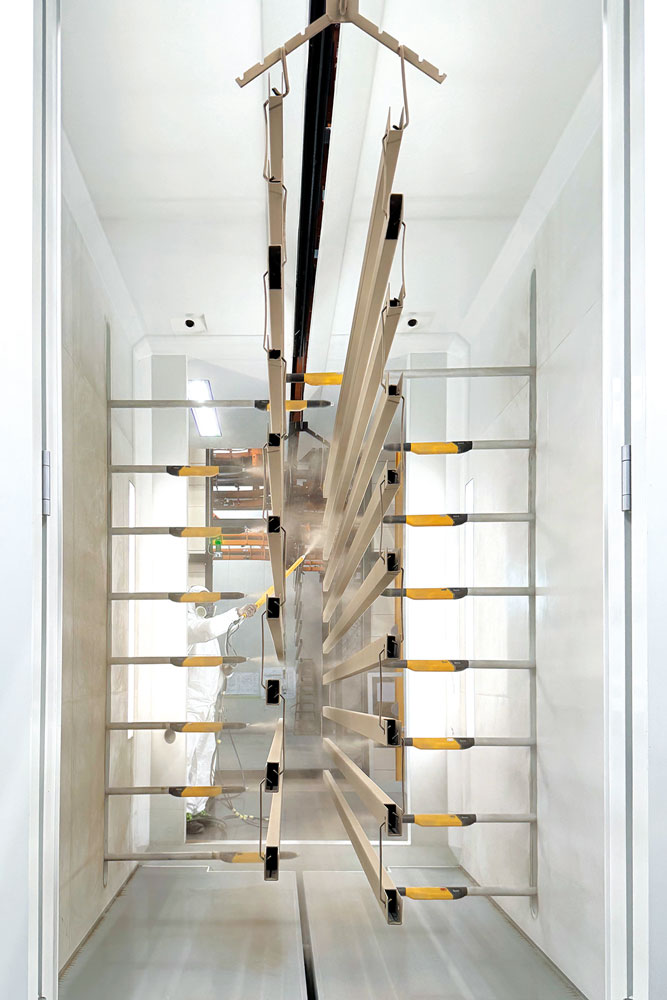 La cabina è dotata di pedane di pre- e post-ritocco. © ipcm®“Dal punto di vista operativo, l’adozione della fase densa rappresenta un salto qualitativo significativo rispetto ai sistemi Venturi tradizionali utilizzati sugli impianti già in uso presso Painter. Sebbene il confronto diretto sui consumi sia complesso, trattandosi di un impianto completamente nuovo e in funzione dallo scorso settembre 2025, i benefici in termini di qualità, stabilità del processo e facilità di gestione sono evidenti” commenta Enrico Pontoglio. “La fase densa consente un trasporto della polvere più stabile e controllato, riducendo la frammentazione delle particelle e migliorando l’efficienza di trasferimento. Questo si traduce in una maggiore uniformità degli spessori, una resa estetica superiore anche su superfici ampie o geometrie complesse e una riduzione significativa delle operazioni di ritocco manuale. In combinazione con il sistema Dynamic Contour Detection, la fase densa permette inoltre di adattare in modo dinamico l’applicazione alle variazioni dimensionali e morfologiche dei pezzi, migliorando ulteriormente la qualità del rivestimento e riducendo gli scarti, nonché la necessità di ritocco, a tutto vantaggio degli operatori in cabina”.