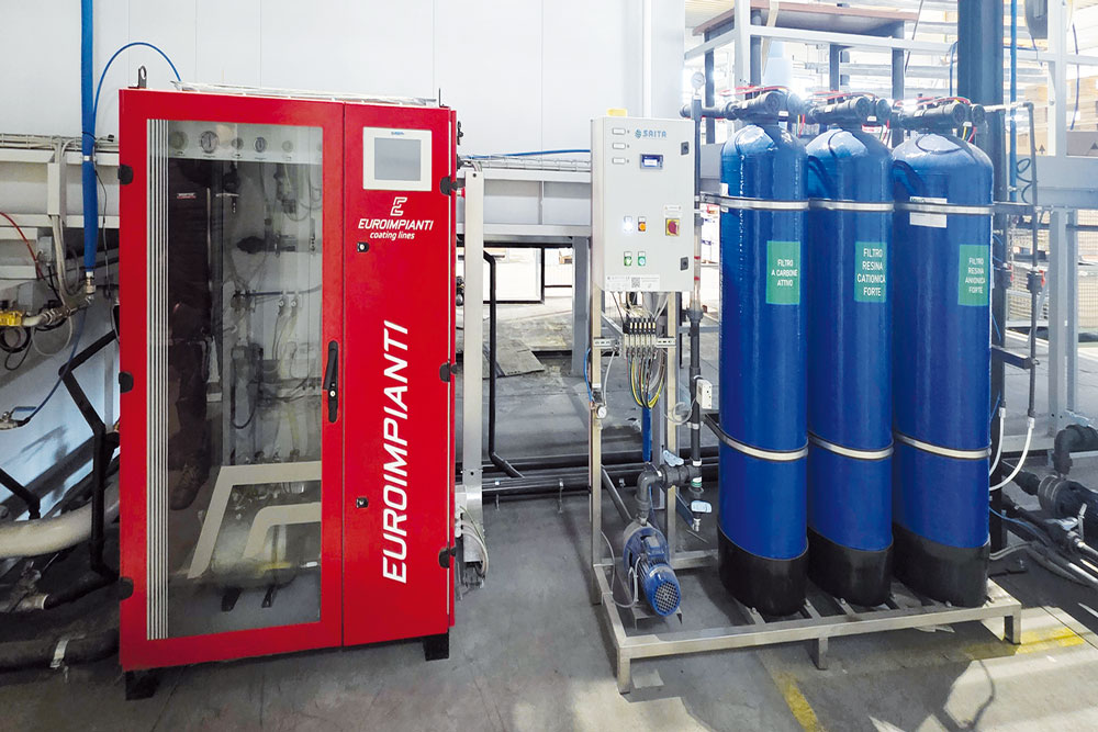 A supporto del nuovo impianto di verniciatura a polvere, Painter ha investito anche nel potenziamento dei sistemi di trattamento delle acque. Attualmente l’impianto è servito da due sistemi di demineralizzazione forniti da SAITA (Limena, Padova): uno da 2.000 litri/ora dedicato alla gestione dell’acqua demineralizzata per il sistema Nebula e uno da 6.000 litri/ora destinato al controllo della conducibilità delle vasche alimentate con acqua di rete.