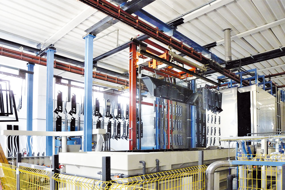 - un anello principale dedicato al ciclo completo dal grezzo al finito, comprensivo di pretrattamento chimico, applicazione della polvere e polimerizzazione in forno;